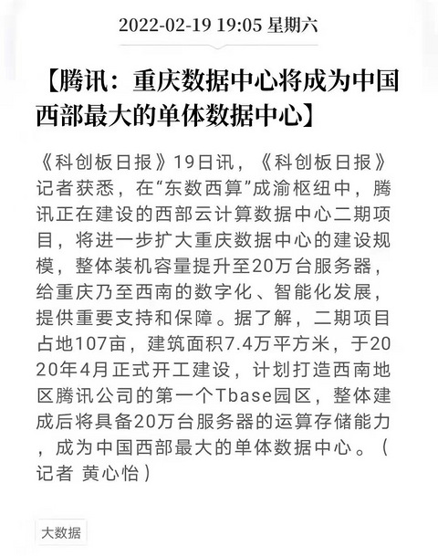 腾讯回应:重庆将成为西南地区最大单体数据中心!