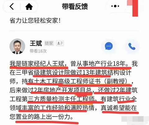 房地产业,内卷如此厉害!可见全国部分地区的新房市有多低迷! 第1次看到这样的讯息,这些链家的中介也太牛了吧,真的是行业太累倦了吗?才导致自己沦为了中介。 难道设计师不好吗?难道教授不好吗?难道项目经理不好吗,为什么偏偏要来卖房子? 这些人的爱好真的有点特别呀。