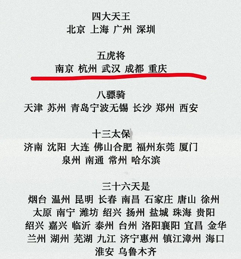 重庆好牛啊,既然是五虎将之一。 最近我看到了一个网友的总结,他把我国的各个城市档次分为了几个梯队。 毫无疑问,四大天王仍然是北京,上海,广州,深圳。 而我们的五虎将是重庆,成都,南京,杭州,武汉。 目前来看,重庆、成都的短板在于人均,城建还是非常不错的,所以说重庆和成都只要把人均的收入提上去,我觉得就非常的亮眼了,甚至很可能挤进我们的四大天王里面,到时候就是6大天王或者五大天王了。