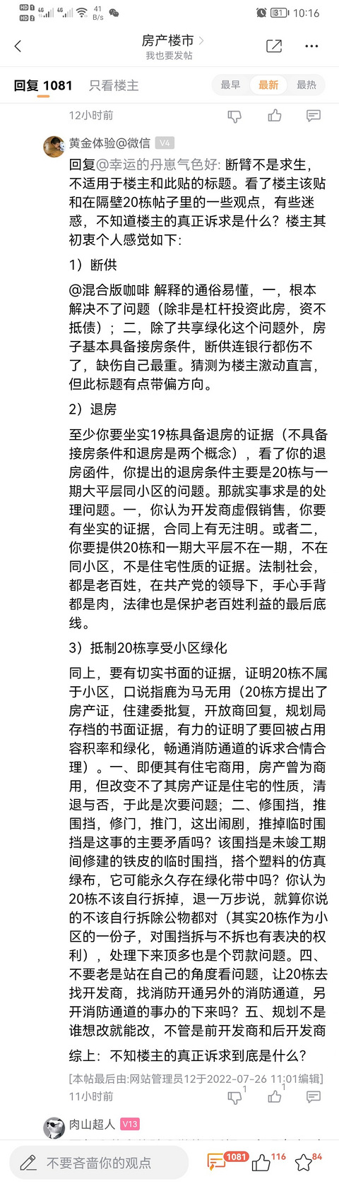 阳光城天安道的闹剧在论坛上热闹了这么多天,我一直在思考为什么会演变成今天的样子,大平层一上来就针对我们20栋业主各种污蔑,侮辱,人身攻击,制造舆论焦点,制造矛盾,是为了什么?而我们从没有对他们恶意中伤。我们在长达两个多月跟开发商和政府的沟通过程中,早就把事实依据相关证据摆在他们眼前看了,他们不可能不知道实际情况。又看到这些路人的评价,我也在思考他们究竟是什么目的,想退房吗?想停供吗?于情于理于法都