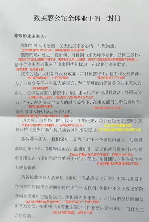长见识了!我们2019年买的蓝光旗下重庆蓝光芙蓉公馆的房子,合同上是22年3月份交房 去年七八月份开始停工。去年年底将芙蓉公馆项目转让给金科控股的公司,期间一直说两个公司在清算也一直没有复工,直到现在原定交房前10天给业主发了一封家书,内容翻译一下就是,所有业主要签补充协议,补充协议要求业主放弃违约金及当时相关承诺的东西,只要有一户不签就不复工。第一次见这么无耻的协议,复工还要讲条件,复工日期也没