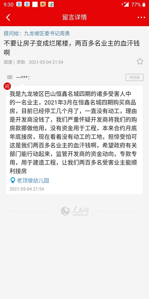 去年四月购买了文旅城C06地块,今年一月开始停工至今,无任何复工迹象,房子那么贵还有可能烂尾,真的是欲哭无泪,劝今年想入手融创房子的谨慎考虑