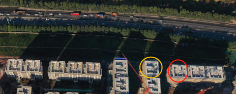 挨着快速路,同样的户型,哪个受噪音影响小一点?ps:黄色的一面是两个卧室和厨房,另外一面是两个卧室是客厅。红色的客厅这一面朝中庭。小区整体比路面高20米左右