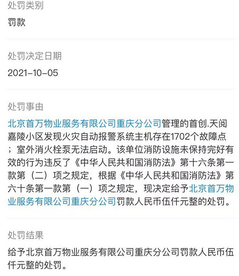 首创置业在重庆首个TOP顶级项目——天阅嘉陵,继之前爆料虚假宣传、欺骗购房、绿地缩水、厕所反水、楼板开裂、物业设施不兼容服务差等问题后,近日再次爆料,消防设施和消防通道不合格。首创天阅嘉陵小区火灾自动报警系统主机存在1702个故障点,这一数字已经大于业主户数,火灾自动报警系统就是形同虚设。室外消防栓和消防泵无法启动,针对以上问题,执法部门对首万物业行政罚款5000元。 除以上问题,首创天阅嘉陵是封