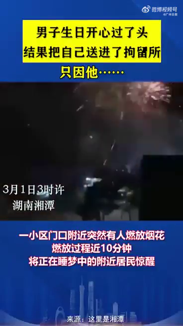 3月1日凌晨3时许,湖南湘潭一小区门口附近,一男子燃放烟花近10分钟,当地110接到了100多个市民投诉扰民的报警电话。民警到场了解到,该男子因庆祝自己生日,一共燃放了7箱烟花。最终,他被公安机关处以行政拘留五日,并处五百元罚款。@广州日报