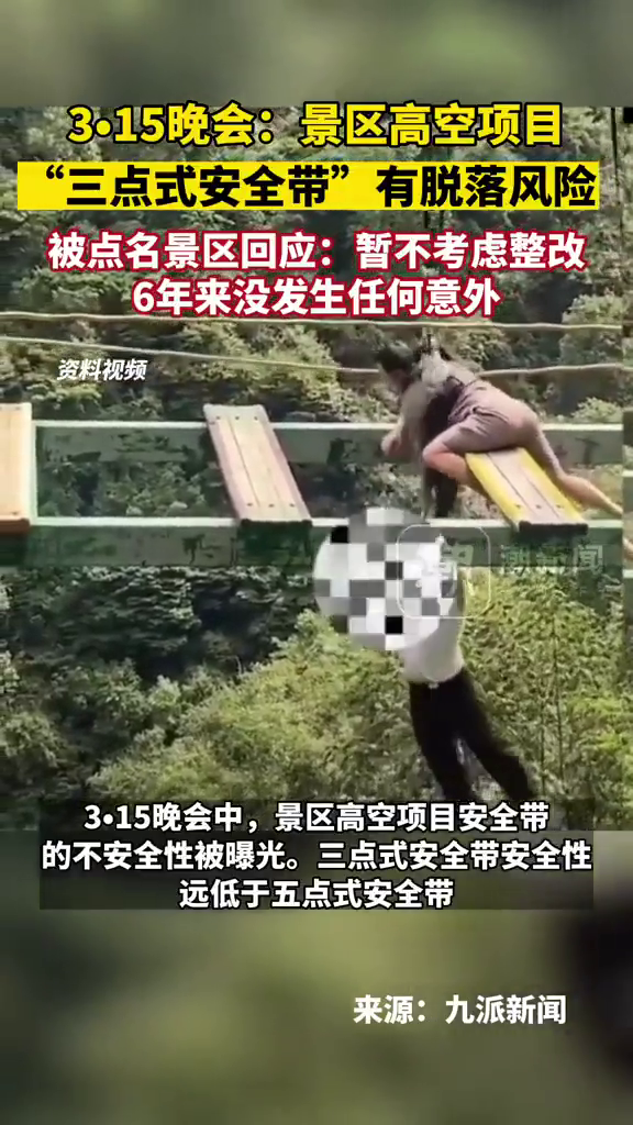 央视“用诚信之光照亮消费信心”315晚会中,景区高空项目安全带的不安全性被曝光。 3月15日晚,九派新闻记者以游客身份联系了南宁市西乡塘区青瓦房古村落的工作人员,他介绍道,景区内有两个项目需要用到安全带,“都是三点式安全带,小孩大人都能用”。对于315晚会提出的安全带问题,他回应称,景区目前没有整改的考虑,因为开放6年来,使用这类安全带没有发生任何意外事件。“现在景区的安全带要达到怎样的安全系数、