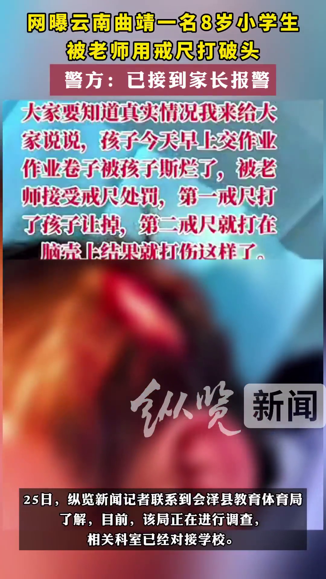 据纵览新闻报道:12月25日,有网友发视频反映,云南曲靖会泽县一名三年级的学生因为交作业时,卷子出现破损,结果被老师用戒尺打破头,血流不止。25日,纵览新闻记者联系到会泽县教育体育局了解到,目前,该局正在进行调查,相关科室已经对接学校。 这名网友自称是孩子的家长,说孩子今年上小学三年级。25日早上交作业时,因卷子被孩子撕烂,结果遭到老师的戒尺惩罚。第一次,老师打孩子时,孩子将手伸了回去,结果,第二