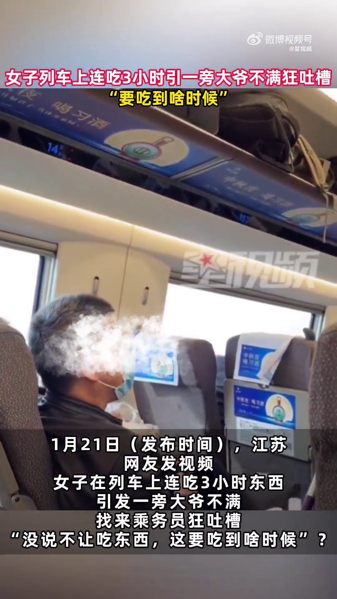 1月21日(发布时间),江苏。网友发视频,女子在列车上连吃3小时东西,引发一旁大爷不满,找来乘务员狂吐槽:“没说不让吃东西,这要吃到啥时候”? via星视频