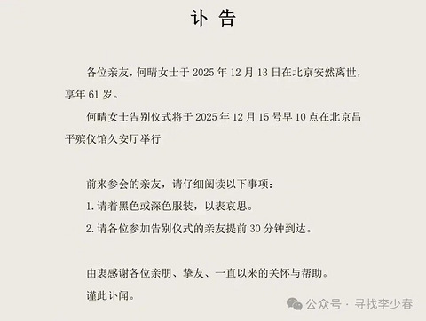12月13日,一份家属发布讣告显示,著名演员何晴在北京安然离世,享年61岁。告别仪式将于2025年12月15号早10点在北京昌平殡仪馆久安厅举行。