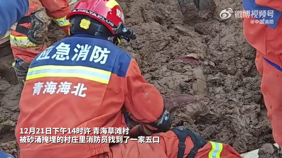 12月21日,青海海东。地震引发砂涌,救援现场,消防员奋力挖掘淤泥寻找失联人员。时间一分一秒过去,扒开的泥浆下面看见爷爷、奶奶和姑姑围成一圈紧紧护着用棉被包裹着的2个小孩。待人员全部挖出,现场进行了集体默哀。via中国消防