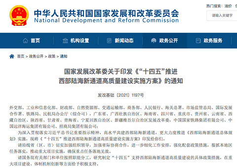 9月2日,国家发展改革委网站公布《“十四五”推进西部陆海新通道高质量建设实施方案》(以下简称《方案》)。《方案》提出,到2025年,基本建成经济、高效、便捷、绿色、安全的西部陆海新通道。