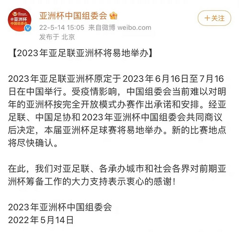 2023年亚足联亚洲杯原定于2023年6月16日至7月16日在中国举行。受疫情影响,中国组委会当前难以对明年的亚洲杯按完全开放模式办赛作出承诺和安排。经亚足联、中国足协和2023年亚洲杯中国组委会共同商议后决定,本届亚洲杯足球赛将易地举办。新的比赛地点将尽快确认。 在此,我们对亚足联、各承办城市和社会各界对前期亚洲杯筹备工作的大力支持表示衷心的感谢!