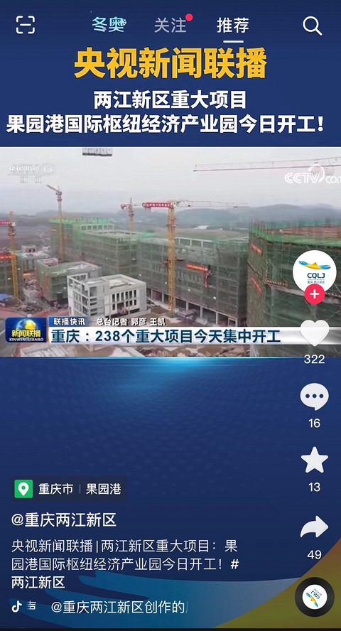两江新区又上新闻联播了,出镜率太高了。