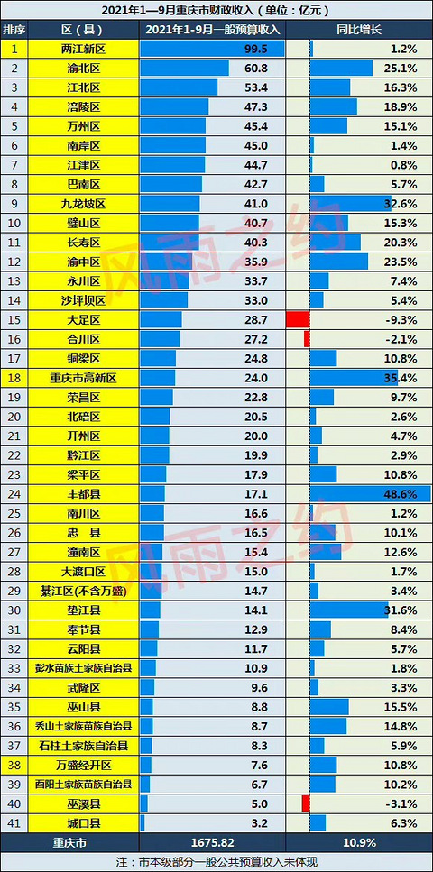 重庆各区2021前三季度财政收入,两江新区和渝北区继续领跑