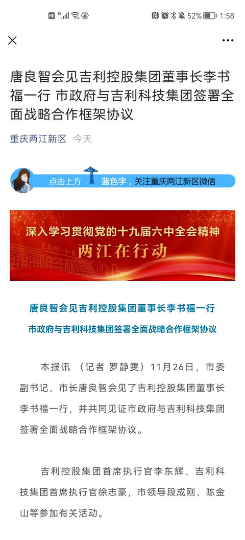 继吉利工业互联网总部落户两江后,吉利科技西部总部签约落户两江