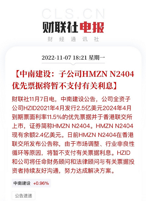中南建设官宣暴雷,暂不支付债券利息