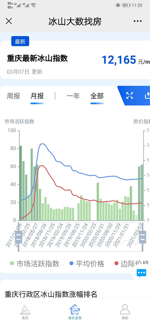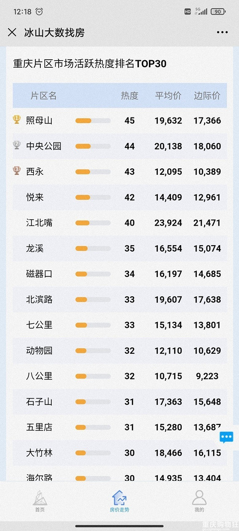 冰山指数活跃度,江北嘴、照母山、中央公园、西永等长期排名前五