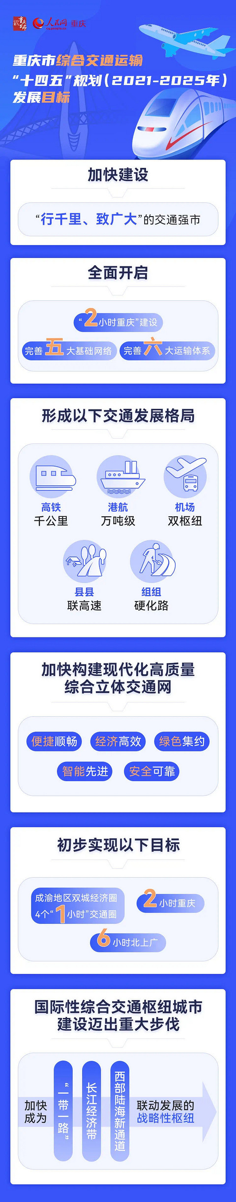10月12日,重庆召开全市交通强市建设工作推进会。会上消息,十四五”是交通强市建设极为关键的五年,是决定性、决战性的五年,重庆将加快实施一批战略性、标志性、引领性的重大交通项目,努力完成投资5000亿元,加快形成“高铁千公里、港航万吨级、机场双枢纽、县县联高速、组组硬化路”的发展格局,全面开启“2小时重庆”建设新征程。 “十四五”期间,重庆综合交通运输如何规划建设?重庆发布对《重庆市综合交通运输“