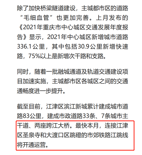 昨天看重庆日报,看到江跳线这个月就要通车了,好兴奋,盼星星盼月亮终于在御景城接房前盼到了,以后回家就方便了,希望能够让我的房子升值,未来可期····