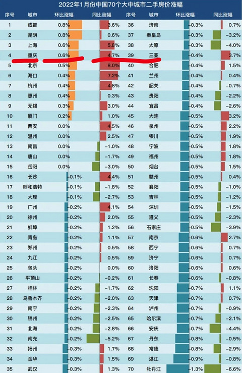 【楼市开始松动了,房价开始上涨了?】 根据2022年1月份70个大中型城市二手房的涨幅排名来看,其实啊,我国的楼市已经开始松动了,房价已经开始回暖,已经开始上涨了。 据了解,1月份70个大中城市,二手房涨幅排名如下: TOP1:成都,环比0.8%,同比3.6%TOP2:昆明,环比0.8%,同比0.6%TOP3:上海,环比0.6%,同比5.8%TOP4:重庆,环比0.6%,同比4.7%TOP5:北京