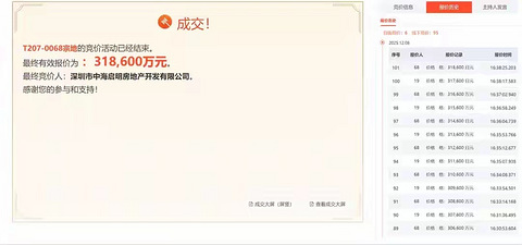 12月8日,深圳湾超级总部基地T207-0068宗地成功出让。该宗地吸引中海地产、华润置地、招商蛇口、华发股份等6家房企参与竞买。经过6轮自由报价、95轮线下竞价,中海地产以总价31.86亿元竞得深圳湾超级总部基地T207-0068宗地,折合楼面地价约77360元/平方米,溢价率约42.49%。