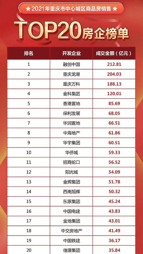 2021年重庆房企销售排行榜来了,融创和龙湖完胜!