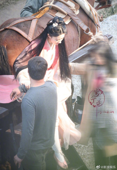 刘亦菲《梦华录》路透曝光,照片中刘亦菲一袭粉衣。