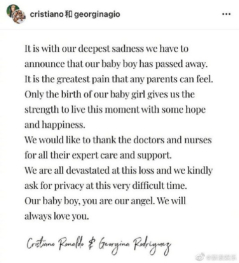C罗@CristianoRonaldo 和女友Georgina悲痛发文,称他们新生龙凤胎中的儿子在分娩过程中不幸去世,仅有女儿顺利出生。“这是为人父母能感受到最严重的伤痛。唯有顺利出生的女儿带来一些希望和幸福,让我们有力量度过这一刻。”