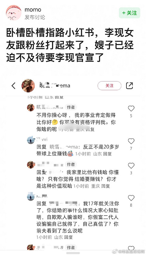 我记得上次爆出李现女朋友都上热搜了但是团队没否认,昨天fs和绯闻女友在评论区争执起来了……吵架内容一直围绕着李现,包括但不限于男方给晓雪买车、晓雪结婚并有一个女儿、逼宫结婚、男方在晓雪读书时陪同等,但当对方让晓雪回答到底是不是李现女友时,晓雪都不正面回应这个问题