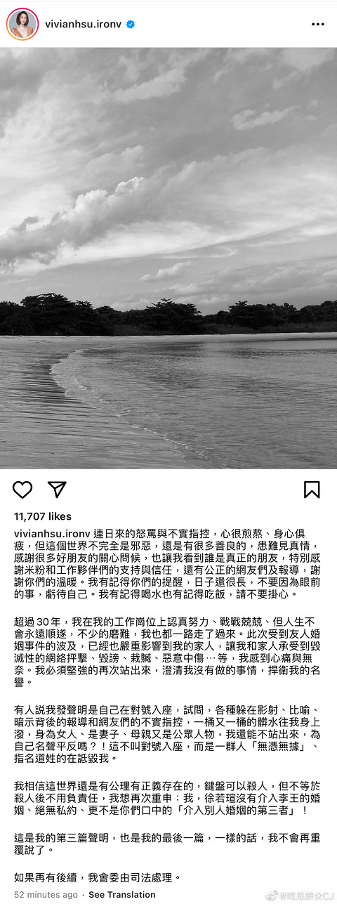 徐若瑄在ins发出第三次声明,重申“我,徐若瑄没有介入李王的婚姻,绝无私约,更不是你们口中的第三者”。 ??? 不知道李靓蕾出来捶不