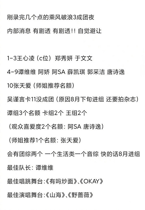 《乘风破浪》成团夜已经录制结束了,网传总冠军是王心凌,最终成团名单疑似是:王心凌、钟欣潼、郑秀妍、于文文、谭维维、郭采洁、薛凯琪、唐诗逸、蔡卓妍、张天爱。吴谨言卡11位没成团。成团后的姐姐还有两个综艺 1、王心凌(C位)