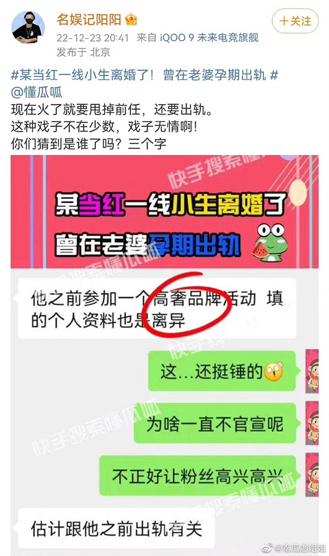 离婚出轨瓜[吃瓜]某当红一线小生离婚了!曾在老婆孕期出轨