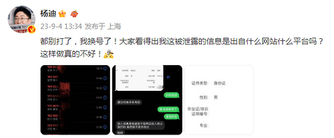 杨迪发文称个人信息遭到泄露,“都别打了,我换号了!大家看得出我这被泄露的信息是出自什么网站什么平台吗?这样做真的不好!”