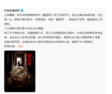 最近的娱乐圈就像《开始推理吧》照进现实,各路人马从蛛丝马迹中找寻《酱园弄》的班底线索。12月14日,《酱园弄》在微博发表官方声明,大意是电影已经开机演员择日再宣,其中最好品的是这一句“主演排序会以其所饰角色的出场顺序为准”。