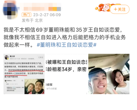 2月27日,许多媒体发帖称董明珠疑似与小34岁的王自如热恋,两人已大方官宣恋情,现在感情很稳定,此事真假难辨,立即引发热议。