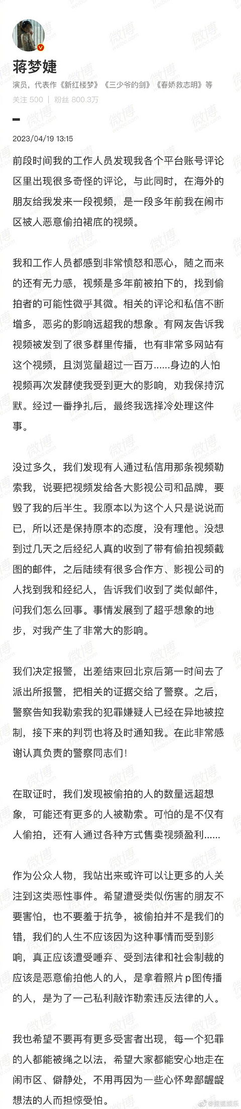 蒋梦婕被偷拍裙底并勒索,现已报案。 “作为公众人物,我站出来或许可以让更多的人关注到这类恶性事件。希望遭受类似伤害的朋友不要害怕,也不要羞于抗争,被偷拍并不是我们的错,我们的人生不应该因为这种事情而受到影响,真正应该遭受唾弃、受到法律和社会制裁的应该是恶意偷拍他人的人,是拿着照片p图传播的人,是为了一己私利敲诈勒索违反法律的人。 ” 好可怕!偷拍的人好恶心啊能不能严惩