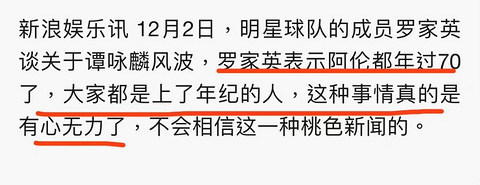 前情提要:一位叫“悲伤牛肉面”直言谭咏麟睡了自己20+左右的女朋友,随后谭咏麟团队辟谣,却遭到这名网友放谭咏麟背影的大锤,最后,该网友删除爆料,息事宁人(图2),在舆论最火的时候,应采儿还点赞了谭咏麟事件相关。 最近,谭咏麟的好友罗家英谈及这场风波直言:“都什么年纪了,应该是没有的事,阿伦和我一样都上了年纪,有心却力不足。” 除了罗家英(图1),汪明荃、洪金宝等人也表示相信谭咏麟,称他不是那一种