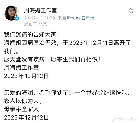 周海媚工作室发布公告12月11日离开了,刚过完57岁生日。