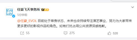 12月18日中午,任豪工作室发文否认新恋情,称任豪目前处于单身状态,并表示“未来也会持续专注演艺事业,努力为大家带来更多更好的影视作品和角色。如有打扰占用公共资源深感抱歉。 ” 此前,有八卦媒体拍到任豪在地下车库与女生甜蜜牵手,并开车送其回家的画面,疑似新恋情曝光