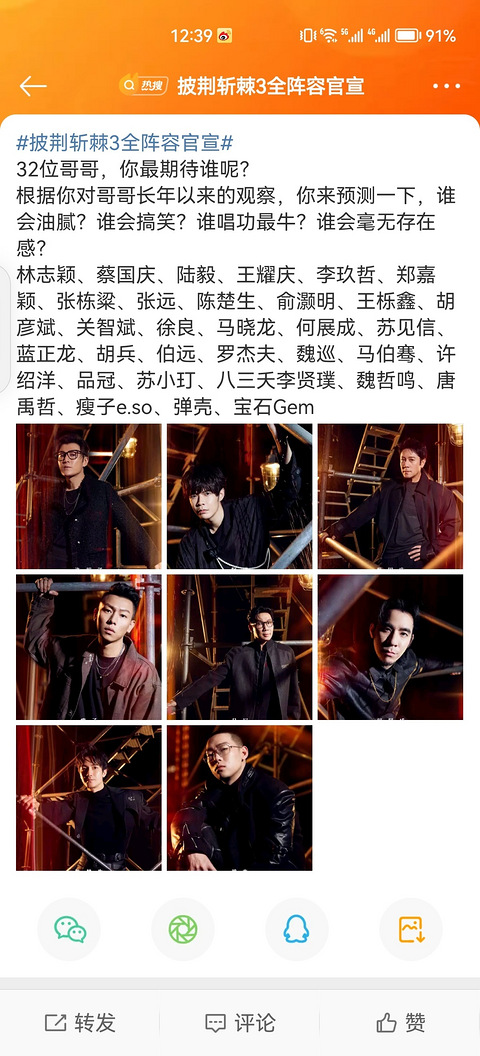 披荆斩棘3全阵容官宣名单了,32位哥哥集结,前不久才追了《乘风2023》,这边《披荆斩棘》第三季的参赛名单又在网上流出,网传6月将开启首期节目的录制。 今天披荆斩棘3全阵容官宣名单了,32位哥哥集结完毕,分别是蔡国庆、郑嘉颖、胡兵、信、品冠、王耀庆、林志颖、陆毅、许绍洋、蓝正龙、李玖哲、关智斌 、陈楚生、张栋梁、胡彦斌、唐禹哲、阿璞、张远、董宝石、徐良、瘦子E_SO、俞灏明、魏巡、马晓龙、何展成、