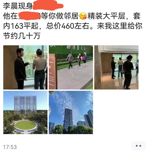 李晨现身重庆渝北某楼盘,好多中介发朋友圈,说李晨等你做邻居,精装大平层,套内163平起,总价460左右。李晨是来拍戏还是买房?有人知道吗