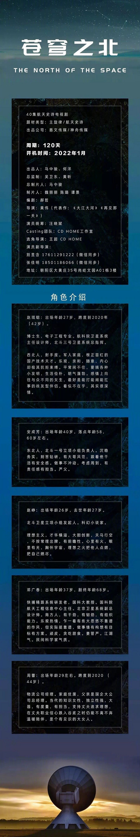 由慈文传媒和神舟传媒出品,航空主旋律剧《苍穹之北》明年初开机,主演已定杨紫,由大江大河的导演黄伟执导,预定上星一线卫视黄金档。 ◆航天工程师安伏诚听到中国启动全球导航系统“北斗3号”建设的消息,辞去海外高薪工作加入北斗研发团队。安伏诚在恩师国家通信中心主任邓广春的支持下,招募了因曾经的失败而失去自信的工程师吴桐,以及追寻自我价值的天才程序员夏飞雪,组成了3人小组,提出了全新的卫星系统方案,并且被纳