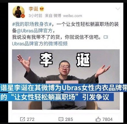 李诞带货女性内衣品牌道歉什么情况?李诞在微博为Ubras品牌女性内衣带货,配文中“让女性轻松躺赢职场”的表述引发质疑:“女性不用努力穿个内衣就能驰骋职场?”“明晃晃的歧视,还以为自己有趣”。李诞带货女性内衣品牌道歉什么情况,有人说身为公众人物带货就带货吧,广告词啥意思?“一个让女性轻松躺赢职场的装备”“胸弟”“躺赢”这词不是赤裸裸的嘲讽吗? 李诞带货女性内衣品牌道歉,甚至有人认为该广告涉嫌违反广告