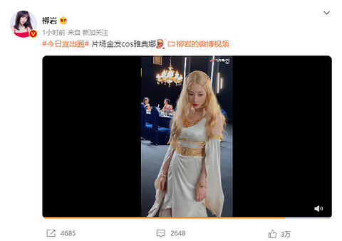 柳岩cos雅典娜造型上热搜,7月14日,柳岩晒出了一段她cos女神雅典娜的视频,柳岩戴着一顶黄色的假发,360度无死角地对着摄像机摆造型,时而忧愁,时而高冷,柳岩的背后还有人在用餐,估计拍摄视频的地点应该是某一个餐厅里、 柳岩cos雅典娜造型上热搜,40岁加的柳岩真心适合性格路线,有人直呼我愿意当那个拐杖哈哈哈哈哈。 柳岩cos雅典娜造型上热搜,10分满分的话,你们打几分?