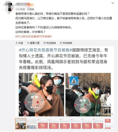 有媒体爆料称开心麻花将无缘参加今年春晚,而就在昨日,开心麻花的演员马丽、常远等人曾现身央视春晚彩排现场。被毙的还有蔡明老师的节目。 太可惜了,今年春晚你们比较想看谁的舞台?