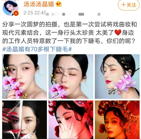 汤晶媚有70多根下睫毛,这个睫毛又密又长也是绝了,真让人羡慕。2月26日,汤晶媚昨日在某平台晒出一组中国风大片,并配文“分享一次圆梦的拍摄,也是第一次尝试将戏曲妆和现代元素结合,这一身行头太珍贵”。还曝出工作人员数了一下自己的睫毛有70多根。 汤晶媚有70多根下睫毛,放大图片数一下,汤晶媚真有70多根吗?