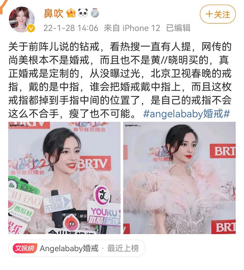angelababy婚戒品牌不是尚美,而是黄晓明定制的品牌?关于前阵儿说的钻戒,看热搜一直有人提,网传的尚美根本不是婚戒,而且也不是黄晓明买的,真正婚戒是定制的,从没曝过光,北京卫视春晚的戒指,戴的是中指,谁会把婚戒戴中指上,而且这枚戒指都掉到手指中间的位置了,是自己的戒指不会这么不合手,瘦了也不可能。 angelababy婚戒品牌不是尚美,而是黄晓明定制的品牌?有人发现是一个名不见经传的牌子。