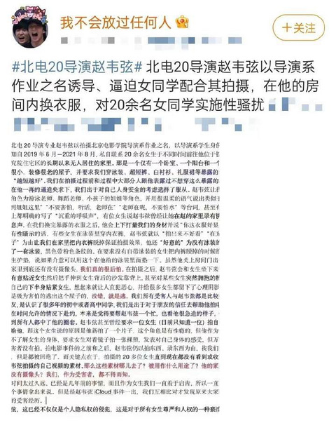 网曝北电20导演赵韦弦被曝性骚扰20余女生,逼迫诱导女生穿泳装和暴露服饰,据网友爆料北电20届导演系学生赵韦弦"性骚扰"女生,借ICloud、网盘账号后私自查看并下载对方私密照片,被发现后又编出第三人并"甩锅"给对方。 一位账号名叫“我不会放过任何人”的网友发长文爆料,北京电影学院导演专业赵韦弦以拍摄作业为借口诱导、逼迫了超过20名女同学,并对这些女生进行了性骚扰。 一时之间,网曝北电20导演赵韦