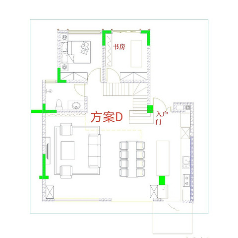大家好,我是装修小白一枚,闲来无事自己在房屋结构图上修修改改,希望能找到一个满意的结构,以便确定结构后续跟设计师沟通时能更多顺畅房屋一共两层楼,目前很纠结的是1楼的布局,我想要书房,又想要大厨房,但是目前的布局不太符合要求,求各位大咖指点迷津自己想了3个方案,利弊分别介绍方案A,保留了入户玄关和书房,厨房被压缩了一截就变小了方案C 将入户门改了,牺牲掉书房,厨房变大,但是又很想要书房怎么破?方案D