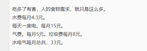 刚刚看了个相亲版的帖子,楼主说自己一个月固定消费只花700块钱,包含吃饭、水电气、电话费、通勤等等。亮点是他的水电气,水费每月4.3元。每天一度电。每月15元。气费,每月5元。垃圾费每月8元。水电气每月总共,33元!!!然后大家都觉得这啷个可能也。于是有人回复,楼主家没得空调…… 我一开始还不信,后来翻了一下他的帖子,结果是真的…… 大家说,在重庆不安空调,到底能不能活出来?我怕是觉都睡不着……